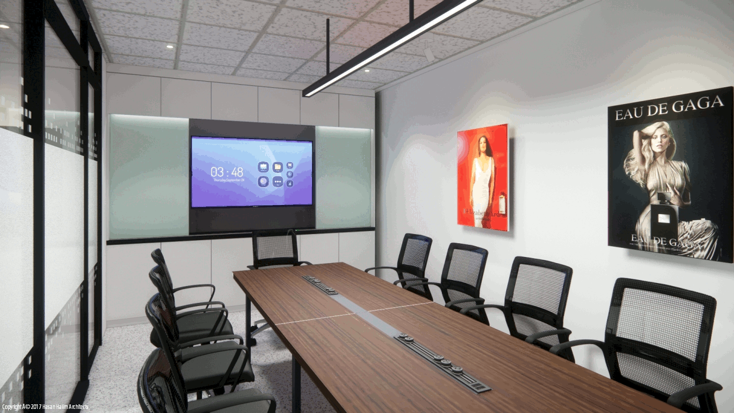 Meja pertemuan yang terbuat dari kayu solid dan berat yang dilengkapi dengan stop kontak listrik dan data untuk memudahkan kebutuhan komunikasi saat ini, sementara papan tulis kaca dan layar LED melengkapi ruangan ini sebagai ruang rapat modern.
