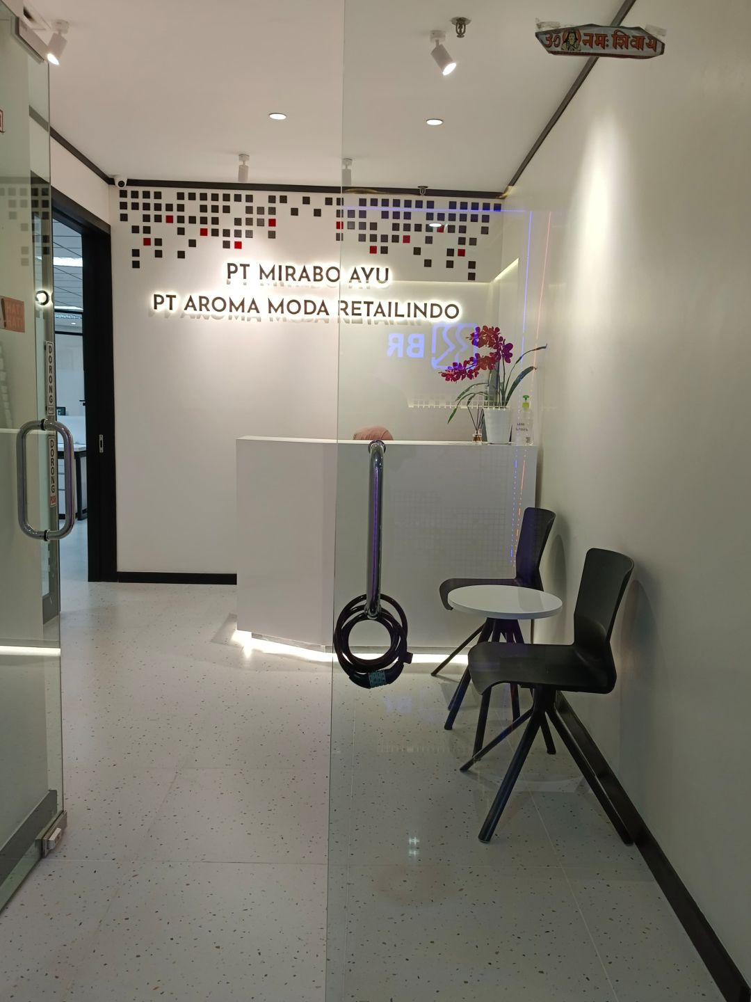 Logo perusahaan, meja depan, kursi dan meja sederhana, dan pencahayaan menjadikan lobi sebagai ruang penyambutan yang menarik.