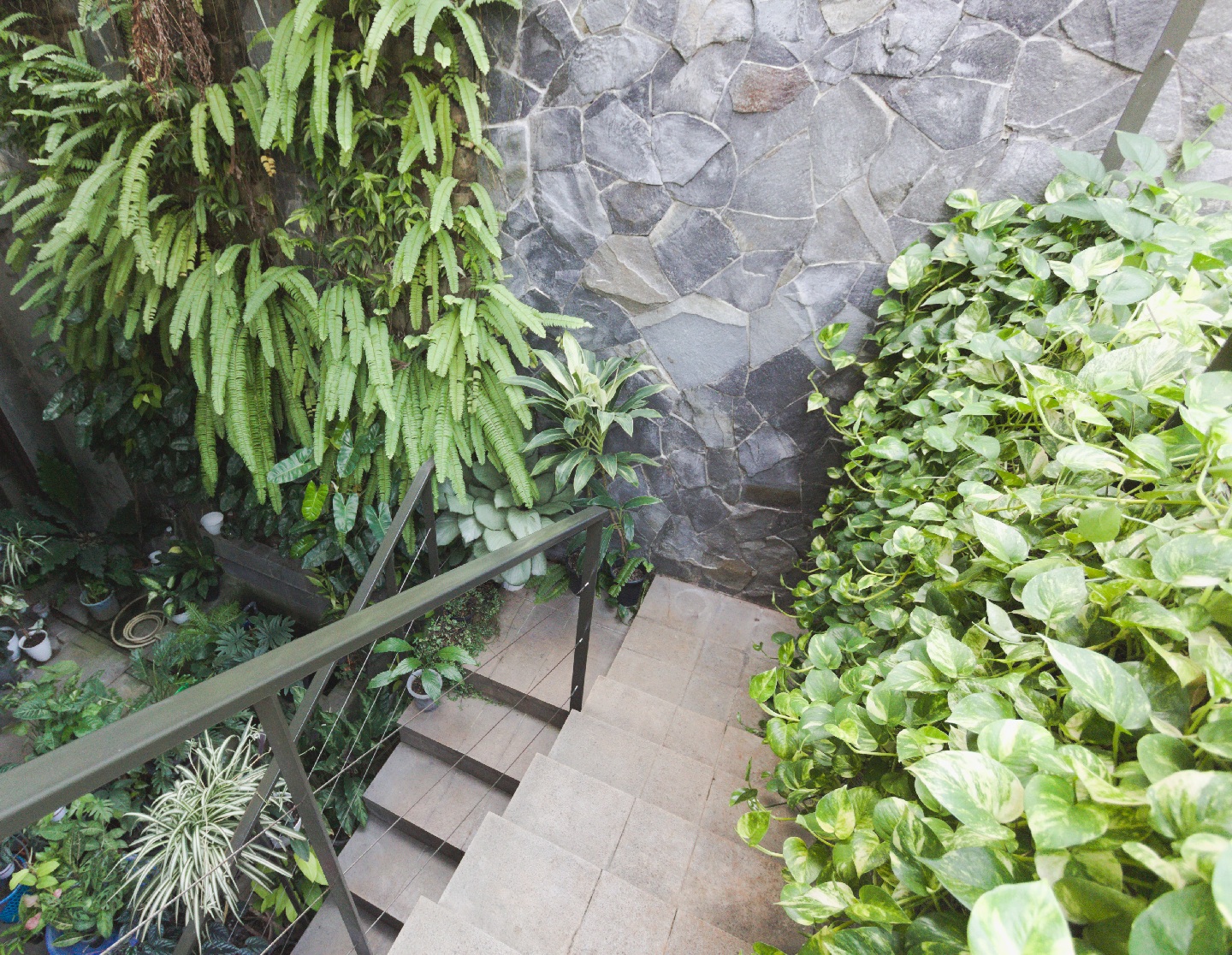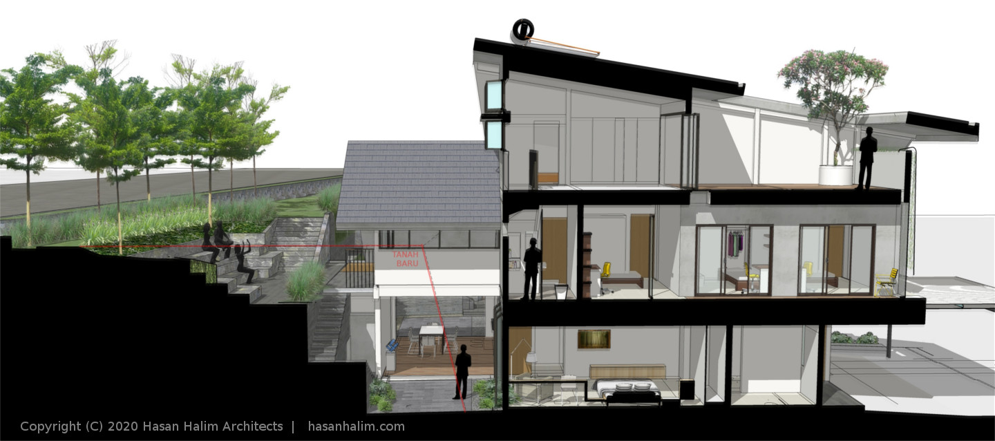 Hasilnya adalah sebuah rumah dengan halaman belakang yang menarik dengan berbagai tingkatan. Ruang duduk di lantai dua terhubung ke halaman atas, sedangkan ruang makan terbuka ke halaman bawah dengan dinding penahan tanah yang dilapis batu susun-sirih sebagai bagian dari lanskapnya.